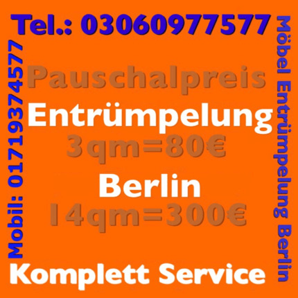 Überzeugen jetzt sich, telefonieren Sie jetzt uns an. Kunden können jederzeit unseren Wohnungsentrümpelung Sperrmüll Entrümpelung pauschal 7qm (7m³) 160Euro oder 14qm 300Euro Teppich Treptow beauftragen. Dieser steht immer zu Ihrem gewünschten schnellstmöglichen Termin für jeden Wohnungsentrümpelung Sperrmüll Entrümpelung pauschal 7qm (7m³) 160Euro oder 14qm 300Euro arbeit zur Verfügung.